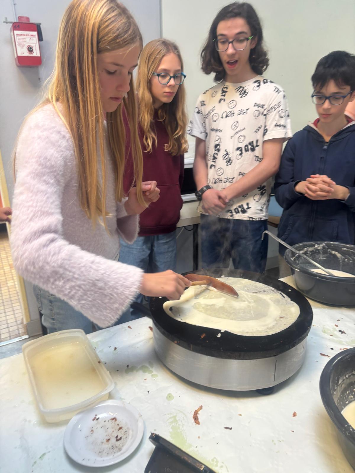 Le jour suivant, au collège, nous avons eu un cours de danse bretonne avec des artistes de la région. Ensuite, nous avons fait des crêpes avec une dame (la propriétaire d’une crêperie) et nous avons pu les manger.